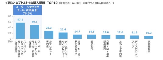 購入場所は、特設会場や通路を含めた「スーパーやショッピングモール、百貨店」が76.6%と最多。「カプセルトイ専門店」「ゲームセンターなどのレジャー施設」は2割台。<図3>