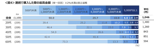 連続して購入した際の最高金額は、「500円未満」が5割を占める。