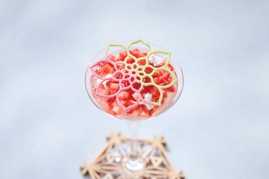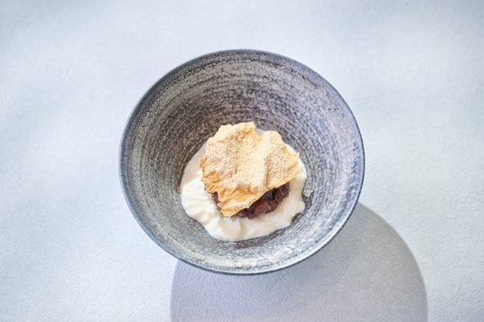 川や湖の薄く張った氷を魚が割る様子から、薄く張った氷を揚げ湯葉で表現しました。中にはフレッシュいちごと甘さ控えめの大納言小豆の自家製あんこ、九州産のもち米、香りが特徴の甘酒パンナコッタを合わせました。パリパリとした揚げ湯葉を割りながらお召し上がりください。