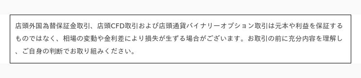 <『外貨ネクストネオ』 取引形態:店頭外国為替保証金取引 委託保証金:各通貨の基準レートにより計算された取引金額の保証金率4%以上に設定(法人のお客様は、保証金率1%以上となる額または金融先物取引業協会が算出した通貨ペアごとの為替リスク想定比率を取引の額に乗じて得た額のうち、いずれか高い額以上の委託保証金が必要となります。為替リスク想定比率とは、金融商品取引業等に関する内閣府令第117条第31項第1号に規定される定量的計算モデルを用い算出します) 売買手数料:0円 『らくらくFX積立』 取引形態:店頭外国為替保証金取引 委託保証金:100%(レバレッジ1倍)、50%(レバレッジ2倍)、33.34%(レバレッジ3倍)(法人のお客様は、100%(レバレッジ1倍)のみ) 売買手数料:0円 【注】お客様がお預けになった保証金額以上のお取引額で取引を行うため、保証金以上の損失が出る可能性がございます。また取引レートには売値と買値に差(スプレッド)が生じます。>