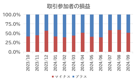 FX取引における実現損益でプラスは48.5%、マイナスは51.5%となった。プラスは前月比7.9%ポイントと大きく改善したものの、損失を計上する投資家の割合も多く、収支は3カ月ぶりのプラス転換とはいかなかった。