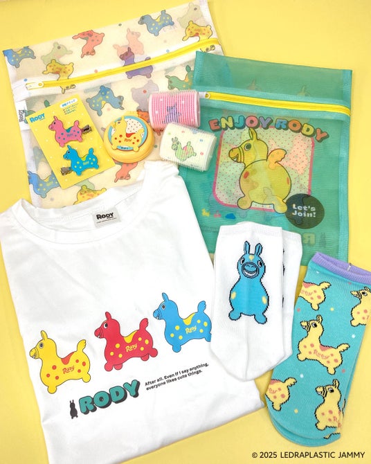 今回登場するアイテムは、「RODY」のカラフルな可愛さを活かしたおもちゃ風のデザインに仕上げました。子供から大人まで幅広い層に手に取ってもらえるよう「洗濯ネット」や「前髪クリップ」など自宅で使えるアイテムから、「Tシャツ」や「ソックス」などファッションアイテムまで、幅広いラインナップで展開します。