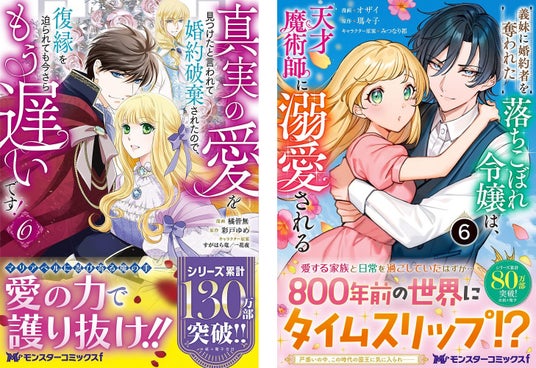 モンスターコミックスfの大人気異世界恋愛ファンタジー『真実の愛を見つけたと言われて婚約破棄されたので、復縁を迫られても今さらもう遅いです!』と『義妹に婚約者を奪われた落ちこぼれ令嬢は、天才魔術師に溺愛される』2作品の第6巻が発売されます。