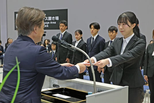新入社員による決意表明では、セントレアグループ各社を代表する3名が社長の前に進み、「空港は旅の出発点であり、多くの人の思い出や再会が生まれる魅力的な場所。そのような場所で働けることに誇りを持ち、社会人としての責任を自覚しながら日々の業務に取り組んでいきたい。これからは仲間とともに成長し、切磋琢磨しながら、空港を支える一員として精一杯努めてまいります。」などと抱負を述べました。