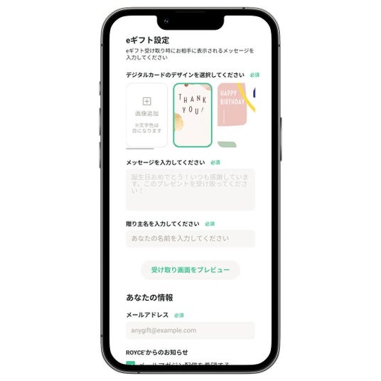 eギフトのURLを送る際に表示される、デジタルカード付きです。お好きなデザインのデジタルカードをお選びいただくか、お手持ちの写真や画像もご利用いただけます。