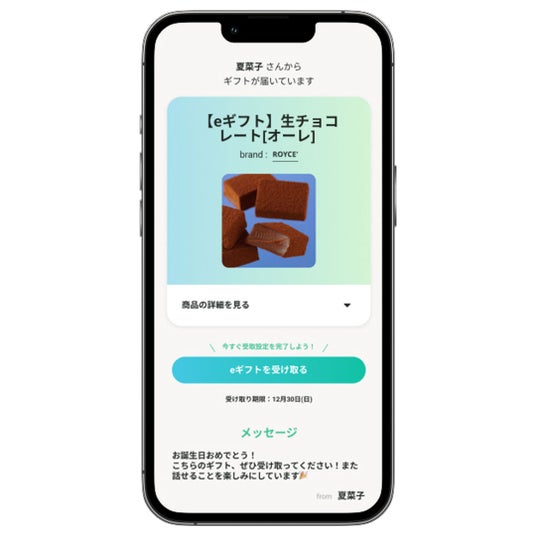 株式会社ロイズコンフェクト(北海道札幌市)は、2025年3月20日よりAnyReach株式会社が提供するeギフトサービス「AnyGift」を公式オンラインショップにて開始いたしました。eギフトとは、贈る相手の名前や住所がわからなくても、LINEやSNS、メールなどでロイズのお菓子を贈れるサービスです。生チョコレートやポテトチップチョコレートを含む人気商品や詰め合わせ商品など、ちょっとしたプレゼントからしっかり感謝を伝えたい贈り物まで、eギフトで気軽にロイズのお菓子を贈りませんか。