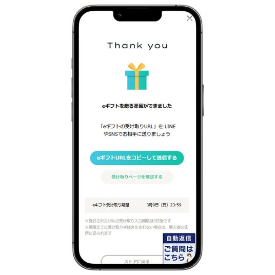 3.URLをLINEやSNS、メールで送信購入が完了すると、eギフト受け取り用URLが発行されます。プレゼントを贈りたいお相手にLINEやSNS上のダイレクトメッセージ、メールなどでURLを伝えてください。