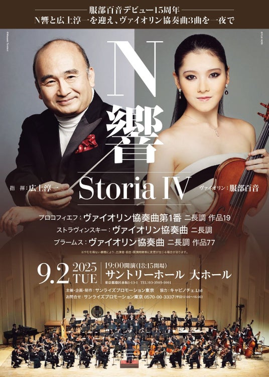 1月13日よりチケット販売がスタートした、ヴァイオリニスト服部百音が新しい視点で発信する演奏会「Storia」。4回目の今回は、2026年に創立100周年を迎える「NHK交響楽団」と、洗練された音楽性と幅広いレパートリーで国内外のオーケストラから高い評価を受けている「広上淳一」を指揮に迎え、9月2日サントリーホールにて開催いたします。プログラムはプロコフィエフ、ストラヴィンスキー、ブラームスの三大コンチェルトを一夜で演奏。3つの異なる音楽の世界へ誘います。国内ではあまり類をみない試みが話題となり残席僅かな席種も。