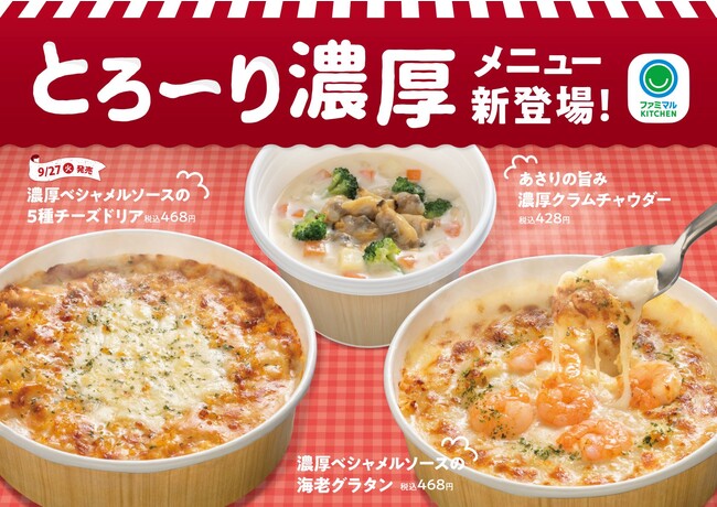 株式会社ファミリーマート(本社:東京都港区、代表取締役社長:細見研介)は、昨年から取り組んでいる5つのキーワードの1つである「もっと美味しく」の一環として、プライベートブランド「ファミマルKITCHEN」から、人気洋食店シェフ監修のもと開発した「濃厚ベシャメルソースの海老グラタン」434円(税込468円)、「濃厚ベシャメルソースの5種チーズドリア」434円(税込468円)、「あさりの旨み濃厚クラムチャウダー」397円(税込428円)を2022年9月20日(火)より順次、全国のファミリーマート約16,600店にて発売いたします。