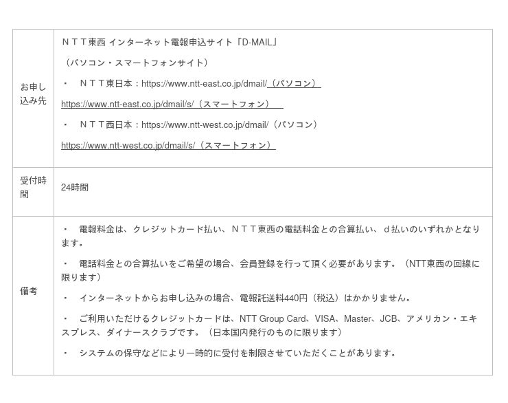 NTT東西のインターネット電報申込サイト「D-MAIL」