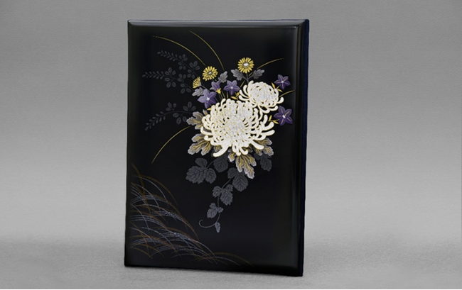 本商品は、高級感ある本漆の上に美しい白菊の蒔絵を施した電報台紙です。気品高い菊と桔梗のデザインは、葬儀、告別式、法事、法要などお悔やみの場に相応しく、公私を問わず大切な方に哀悼の意をお伝えします。
