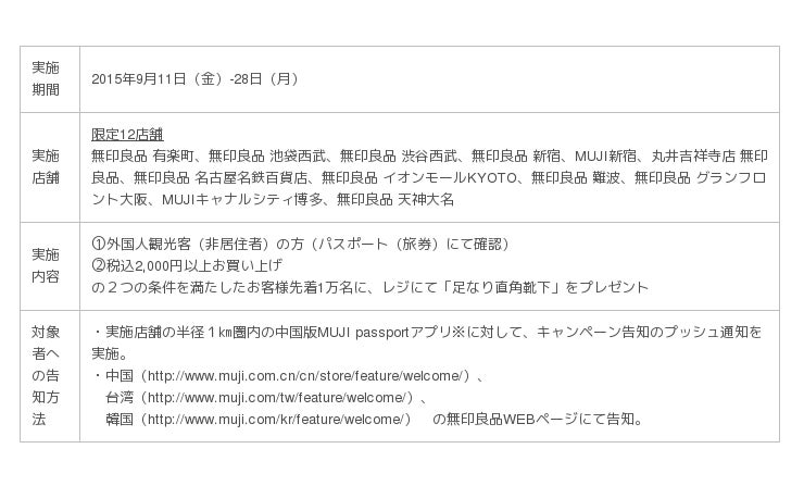 無印良品を展開する株式会社良品計画(東京都豊島区/代表取締役社長 松崎曉)は、全国の限定12店舗にて、外国人観光客の先着1万名様に、無印良品の人気定番商品、足なり直角靴下をプレゼントするキャンペーンを9月11日(金)から実施します。