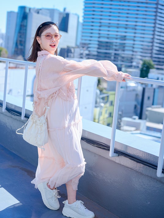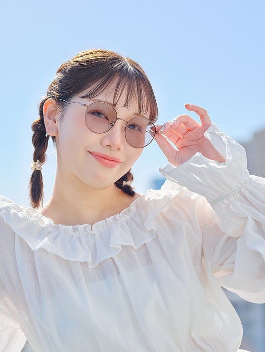 丸みのあるシェイプが可愛いサングラスは、ふんわりワンピースと合わせたコーデがおすすめ。丸み具合や大きさにもこだわったお気に入りのデザイン。