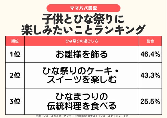 2026年のひな祭りは、「お雛様を飾る」「スイーツを楽しむ」といった王道の過ごし方が主流である一方、親子での料理や工作など“体験型”の楽しみ方をするという回答も。