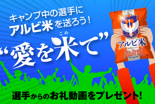 プレシーズンを戦う選手に「アルビ米」を送ろう!長いシーズンを戦ううえで、プレシーズン中の体作りは必須!シーズン前、キャンプでトレーニングに励んでいる選手たちにアルビ米を食べてもらい、1年間戦える身体づくりをサポート!