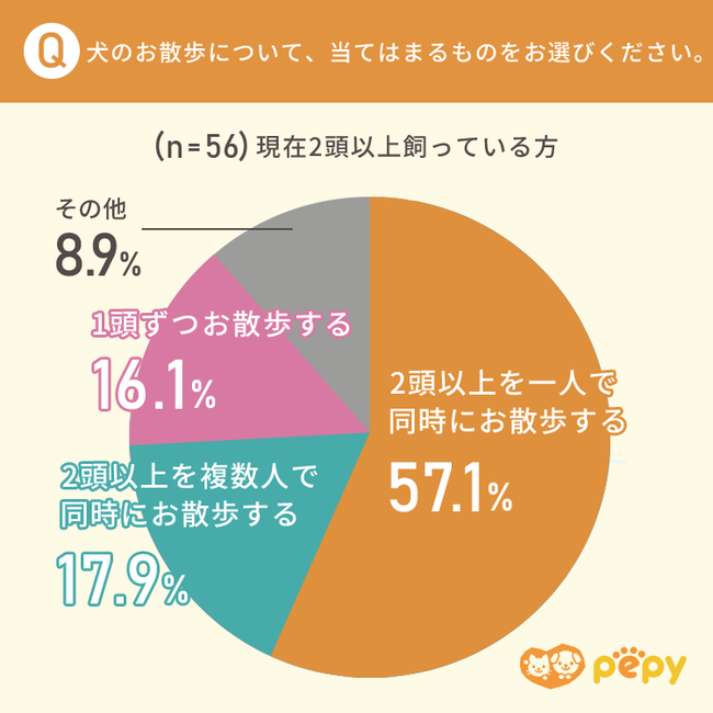 「2頭以上を一人で同時にお散歩する」と回答した方が57.1%と、もっとも多い結果になりました。