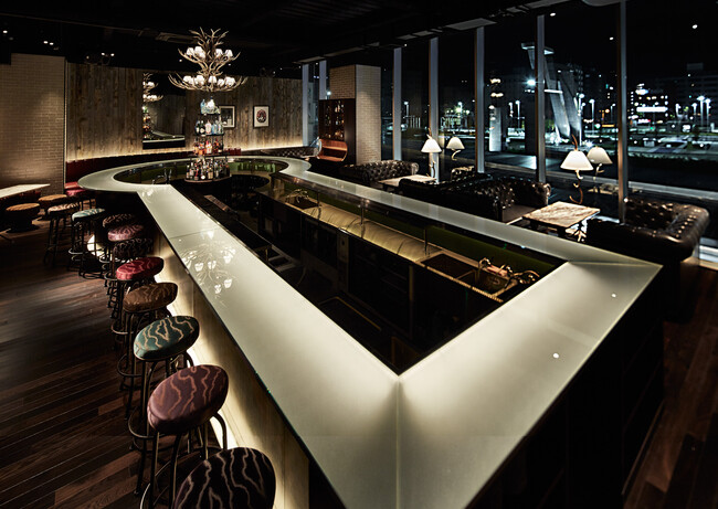 店内で存在感を放っているのは、中央の大きな円形カウンターと天井の高さを生かした山小屋をイメージしたシャンデリアです。このオーナメントがフロアの広さを印象付けており、さらに、外の景色を一望できる3.8mの大窓が開放感ある空間造りに一役買っています。カウンターの幻想的なライティングも非日常空間を演出。また、窓際のソファー席はどっしりと腰掛けられるタイプで、空間も取られており、ソーシャルディスタンスが保たれています。店内には完全個室も設けられ、プライベートな時間をお過ごし頂けます。同店は、広い店内だからこそソーシャルディスタンスの確保は十分で、感染症対策を徹底しながら、バーの雰囲気も壊さずにお楽しみ頂けるよう務めています。アルコール消毒や検温なども徹底し営業します。