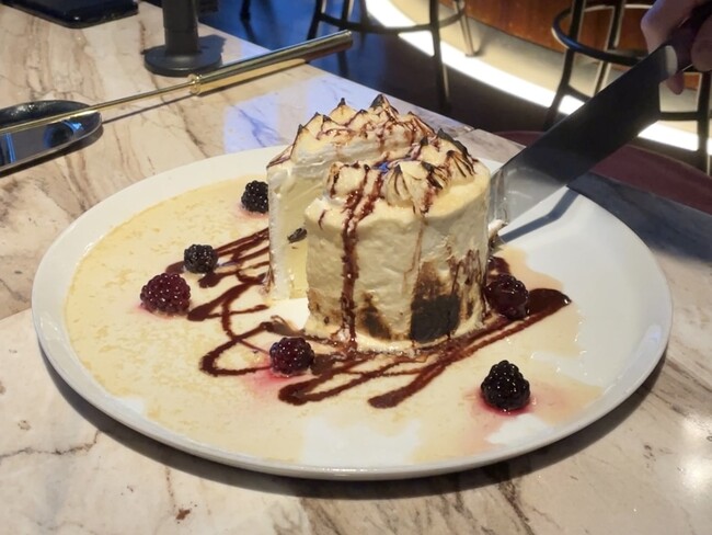 2022年12月、アイスケーキ「ベイクド・アラスカ」を提供開始します。お客さまの目の前で青い炎が上がるフランベを実演します。
