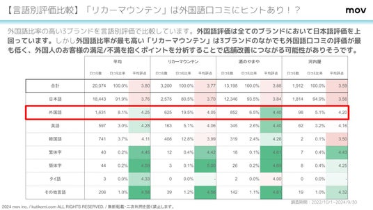 しかし外国語比率が最も高い「リカーマウンテン」は3ブランドのなかでも外国語口コミの評価が最も低く、外国人のお客様の満足/不満を抱くポイントを分析することで店舗改善につながる可能性がありそうです。