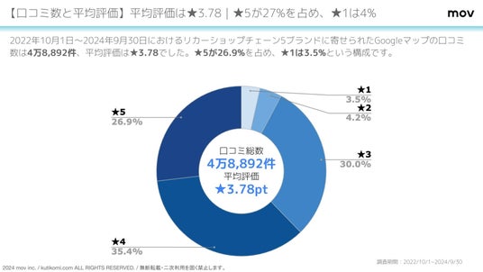 2022年10月1日~2024年9月30日におけるリカーショップチェーン5ブランドに寄せられたGoogleマップの口コミ数は4万8,892件、平均評価は★3.78でした。★5が26.9%を占め、★1は3.5%という構成です。