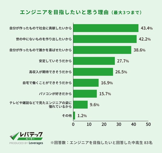 エンジニアを目指したいと思う理由については、1位は「自分が作ったもので社会に貢献したいから(43.4%)」となり、「世の中にないものを作り出したいから(42.2%)」「自分が作ったもので誰かを喜ばせたいから(38.6%)」が続きました。