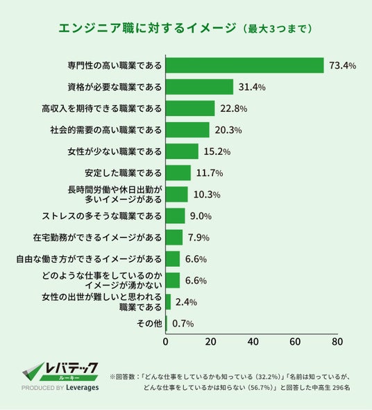 エンジニアという職業を知っている*1と回答した中高生に、「エンジニア職」についてのイメージを聞いたところ、7割以上が「専門性の高い職業である(73.4%)」と回答しました。