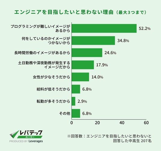 一方、エンジニアを目指したいと思わない理由で最も多かったのは「プログラミングが難しいイメージがあるから(52.2%)」となり、約3人に1人が「何をしているのかイメージがつかないから(34.8%)」と回答しました。