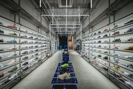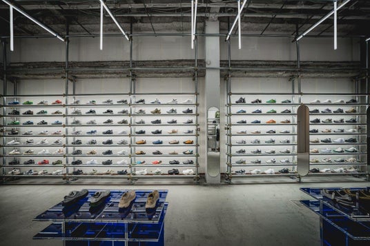 既存仕上げを、解体した後のスケルトン空間に仮設用単管足場で構成された荒々しい印象の空間の中に、スニーカーを中心とした商品が引き立つ内装とし、atmosのブランドカラーである様々な「ブルーマテリアル」を使用した什器や内装仕上げが、商品と共に空間を印象づけています。