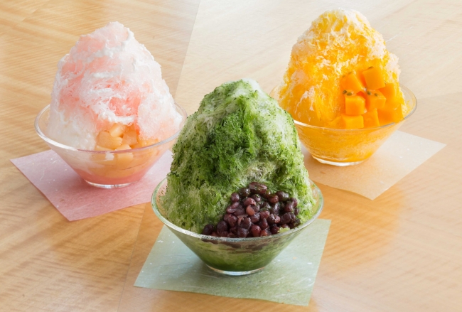 ひと口ごとに繊細な口どけをお楽しみいただけるよう、きめ細かく削った氷の中にアイスクリームを閉じ込めたスタイルのかき氷です。別添えでご用意した、2種類のソース(抹茶は、大納言と練乳)を掛け合わせてお楽しみいただけます。冷えたままの氷を削るのではなく、一度冷凍庫から取り出し、常温で少し溶かした氷を削ることで、ふわふわの食感を出すことにこだわりました。口に入れた瞬間のふわっとした食感とともに、一番美味しいタイミングでご提供できるよう、試作を重ねました。