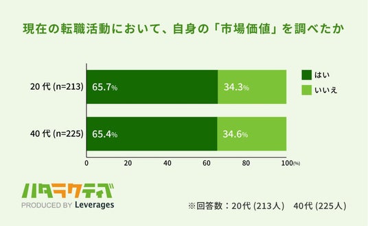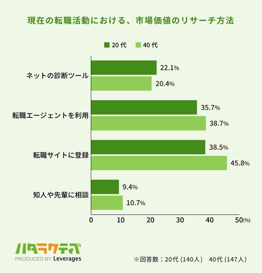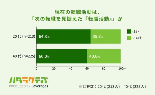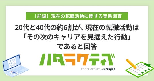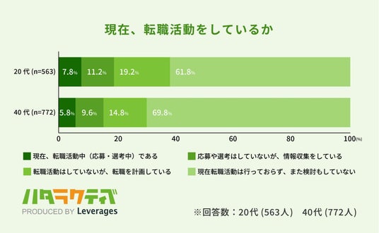 レバレジーズ株式会社が運営するフリーター・既卒・第二新卒向け就職支援サービス ハタラクティブ(https://hataractive.jp/ )は、若者のキャリアに関する実態を把握するため、20代と40代の正社員1,335名(20代:563名・40代:772名)を対象に、現在の転職活動に関する実態調査を行いました。