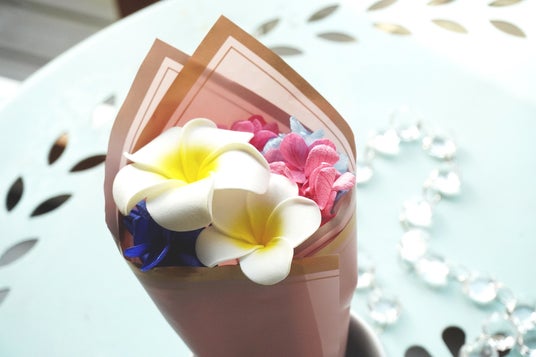 プルメリアとアジサイの花束つきで、華やかに贈れる