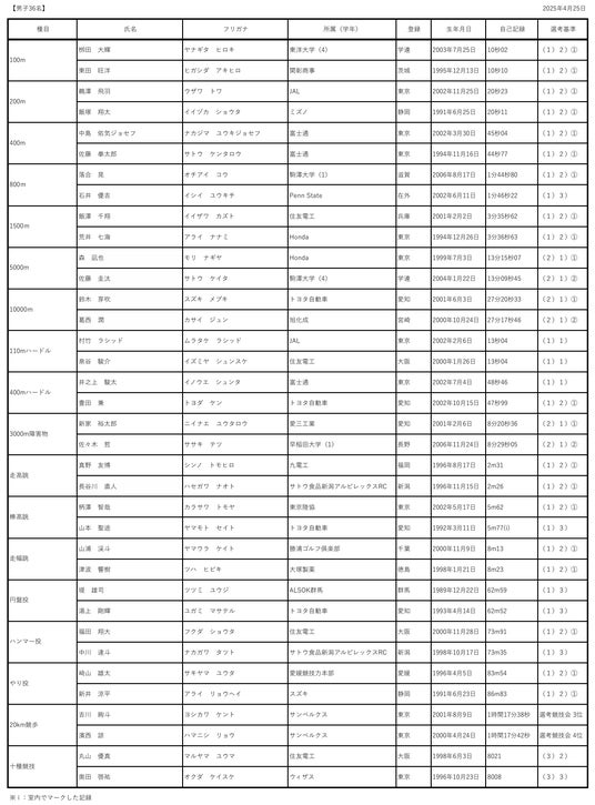 パリ2024オリンピック競技大会 男子110mハードルで5位入賞の村竹ラシッド(JAL)、ブダペスト2023世界陸上男子110mハードルで5位入賞の泉谷駿介(住友電工)、東京2025世界陸上男子20km競歩日本代表の吉川絢斗(サンベルクス)、女子35km競歩日本代表の梅野倖子(LOCOK・20km競歩)、前回大会(2023バンコク)金メダリストの柳田大輝(東洋大学・100m)、鵜澤飛羽(JAL・200m)、佐藤拳太郎(富士通・400m)、丸山優真(住友電工・十種競技)、山本有真(積水化学・5000m)、秦澄美鈴(住友電工・走幅跳)、森本麻里子(オリコ・三段跳)など計71名が出場予定です。