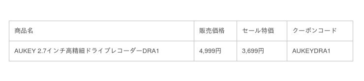 AUKEY 2.7インチ高精細ドライブレコーダーDRA1(URL:https://amzn.to/2JXJ4IK)の26%オフセールをAmazon.co.jpにて開催致します。3月8日(日)から3月12日(木)まで、クーポンコード「AUKEYDRA1」を利用することで3,699円でご購入いただけます。