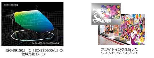 新商品『SC-S9150』は、新たにグリーンインクを追加し、色域が最大19%拡大しました。これにより、コーポレートカラーや厳密な色指定にも対応でき、圧倒的な表現力を実現します。また、最新のプリントヘッドと、ヘッドの性能を最大限に発揮できるインク吐出技術により、さらなる高画質を実現します。従来機「SC-S80650/L」と比べプリントスピードも最大11%向上しました。さらにニュースタンダードとして圧迫感を抑えた新しい本体デザインを採用し、快適な作業環境を提供します。