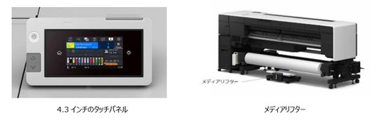 新機能として、見やすく使いやすい4.3インチのタッチパネルを搭載しました。また、お客様の声にお応えして、指定した印刷長にメディアが到達するとタッチパネルで通知される機能も追加し、効率的な作業を可能にしました。さらに、メディアのセット位置を見直し、これまで中腰で姿勢を変えながら行っていたメディア交換作業が、膝をついたまま姿勢を変えずに行えるようになりました。加えて、今回メディアリフターを本体に同梱。重いメディアも簡単にセットでき、作業時の負担を軽減します。