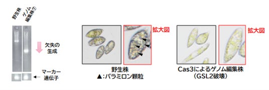 GSL2遺伝子の破壊処理を行った集団から、パラミロン粒が見られない細胞を選別・単離し、株として樹立しました。この結果、対象とした遺伝子領域においてPCR法(注3)によるDNA塩基配列の欠失が検出され(図3)、CRISPR-Cas3法がユーグレナに対するゲノム編集に適用可能であることが実証されました。