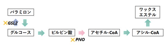 CRISPR-Cas3法によるゲノム編集において、作製した株の機能性食品(タンパク質の高含有化など)としての利用を想定し、破壊対象遺伝子として、パラミロン(注1)合成に関与するGSL2遺伝子を選択しました。また、作製した株の機能性食品(パラミロンの高含有化など)や化成品(パラミロン誘導体など)としての活用を想定し、破壊対象遺伝子として、ワックスエステル(注2)合成に関与するPNO遺伝子も加えて選択しました(図2)。