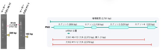 また、PNO遺伝子を破壊処理した集団からも、対象遺伝子領域においてPCR法で欠失が検出される細胞を探索した結果、PNO遺伝子において大きな欠失が存在する2株の変異体を選抜することに成功しました(図4)。