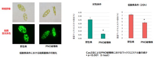 さらに、PNO変異体のうち1株について、脂質蓄積に関する性質を調べた結果、低酸素条件での蛍光色素染色では、脂質を蓄積するものの、野生株と比較して蓄積量が少ない様子が観察されました(図5左)。また、実際に脂質を抽出・定量したところ、野生株と比較して有意に脂質蓄積量が少ないことが確認されました(図5右)