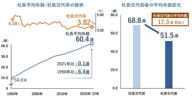 帝国データバンクの調査では、2022年時点の社長の平均年齢は60.4歳となった。前年から0.1歳上回り、統計として遡れる1990年から32年連続で上昇し、過去最高を更新した。また、2022年に社長が交代した割合は3.82%で、前年から0.1pt低下した。2010年以降は3%台後半で推移した。加えて、社長が引退する平均年齢は68.8歳となり、70歳が目前の段階で交代している結果となった。