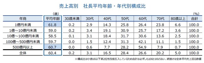 社長平均年齢を売上高別にみると、「1億円未満」が61.8歳で最も高かった。次いで「500億円以上」の大企業が60.7歳で続き、50歳以上が9割超を占めるという特徴がみられ、なかでも60代に半数以上が集中している。