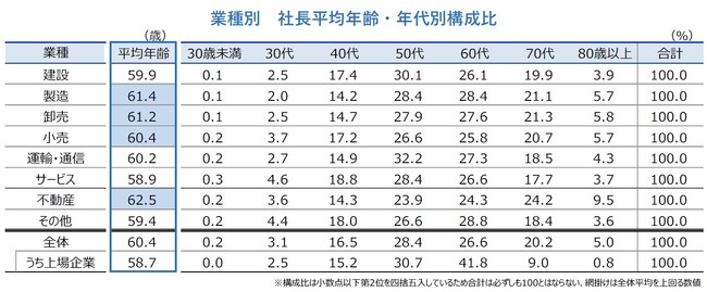 <業種別> 「不動産」が62.5歳と高水準、若手起業家が多い「サービス業」は58.9歳