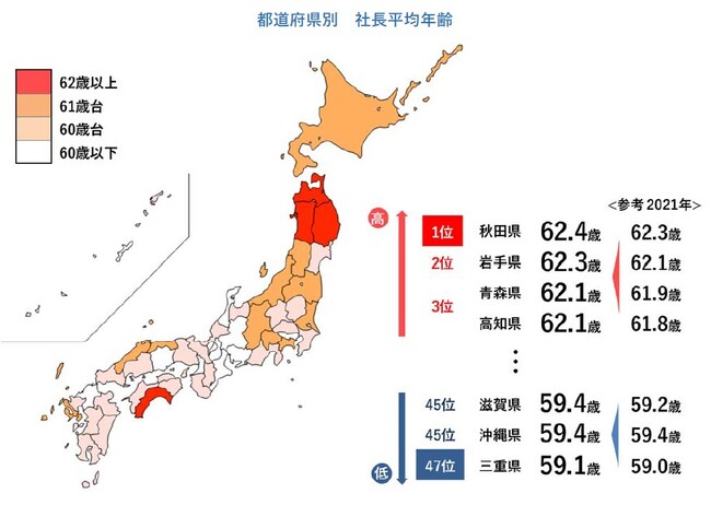 なお、47都道府県のなかで社長平均年齢が前年から低下した地域はなく、地域を問わず社長の高齢化が進行している。社長平均年齢が60歳を下回ったのは10都府県にとどまり、全国のなかでも新興企業が集まり開業率が高い大都市圏では、比較的低位な傾向がみられた。