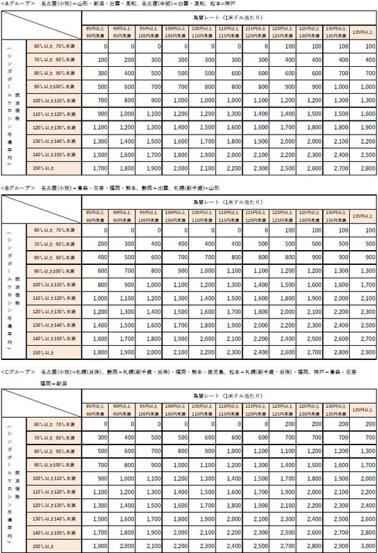 なお、燃油特別付加運賃は、シンガポールケロシン市況価格および為替レートの変動に応じて、 1ヶ月毎に見直しております。