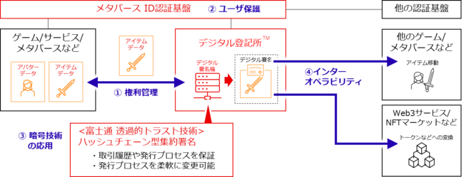 (注7)デジタル登記所TM:メタバースやゲーム世界で発行されたデジタルデータに対し、デジタル署名を発行・検証可能とする権利管理サービス。