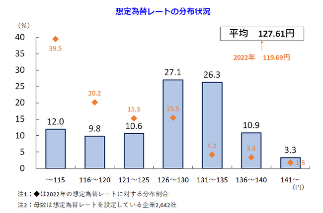 2023年4月時点における、企業の想定為替レートは平均1ドル=127.61円(以下、1米ドル当たりの円レートを示す)となった。前年4月時点の119.69円から7円92銭の円安水準を想定していた。また中央値、最頻値はともに130円だった。