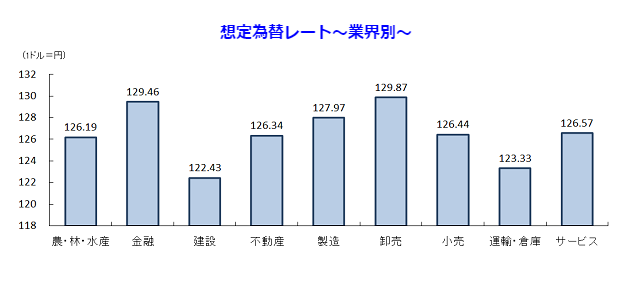 想定為替レートを業界別にみると、『卸売』や『金融』が129円台を想定している一方で、『建設』や『運輸・倉庫』の2業界は120円台前半とみている。