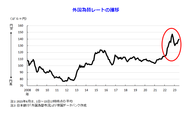 2017年以降は比較的、外国為替の実勢レートと想定レートに差異はなく推移していた。しかし、2021年後半から両者間で想定レートよりも実勢レートが大幅な円安水準を示す状況が続いている。2023年の名目為替レートは1ドル=130円台(月中平均、終値ベース)で推移しているが、直近では6月15日に1ドル=140.09円(東京市場、スポットレート、17時時点)を付けるなど、140円前後での推移となっている。現時点で急激な円安・ドル高は進みそうにないが、為替レートは仕入れ価格を通じて海外との取引を持たない企業の収益を悪化させる要因ともなり、当初の想定以上の為替変動は企業業績に影響を与えることになろう。