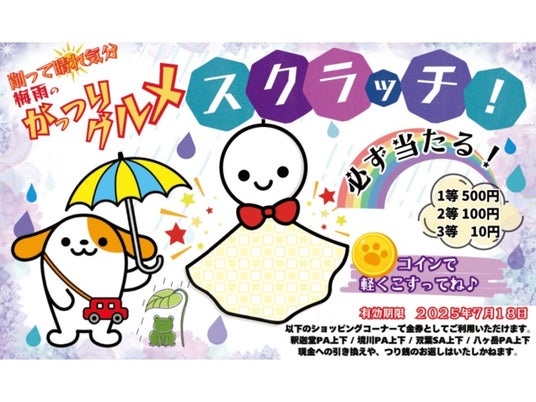 なお、雨の日にはスクラッチ券を2枚お渡しします。スクラッチ券は、1等500円、 2等100円、3等10円のいずれかの金券として、対象のSA・PA内の各ショッピングコーナーにてご利用いただけます。