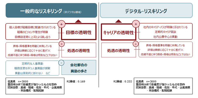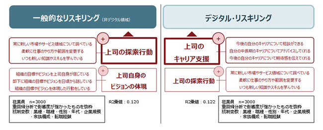 一方、デジタル・リスキリングには、一般的なリスキリングと同様に「探索行動」が影響しているほか、今後の自分のキャリアを相談できるといった「キャリア支援」についての上司の姿勢がよりポジティブに影響している。